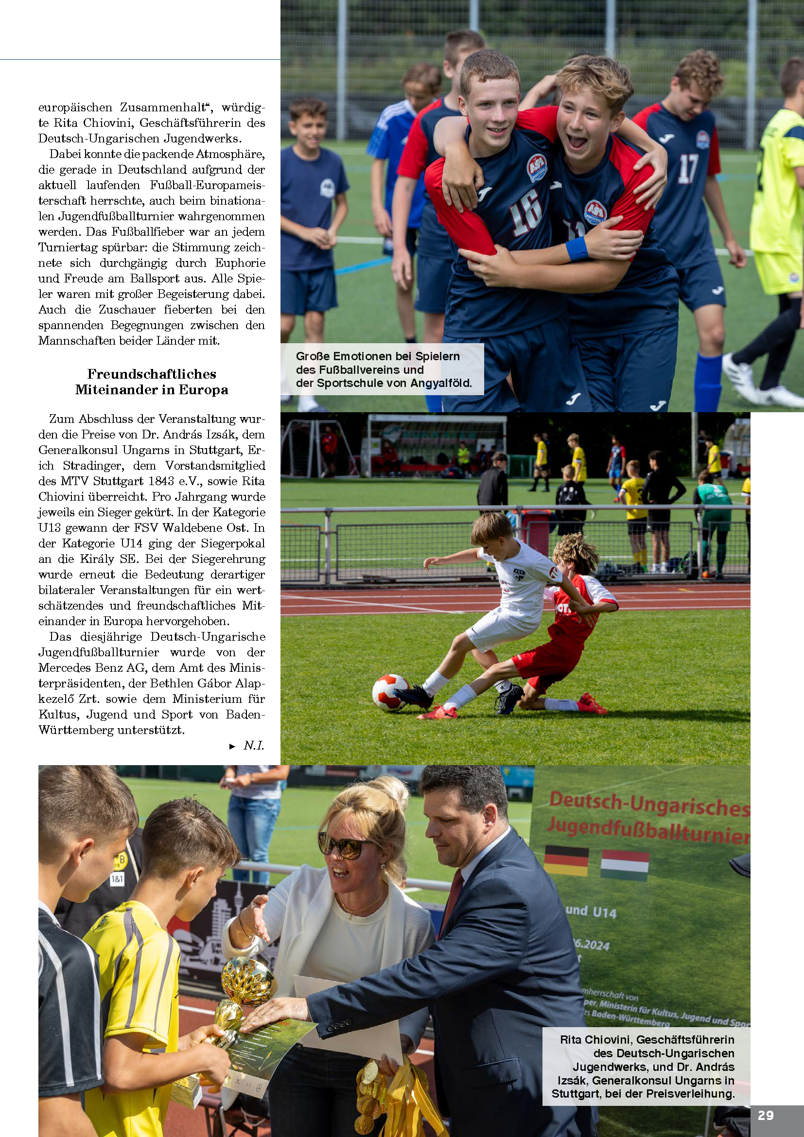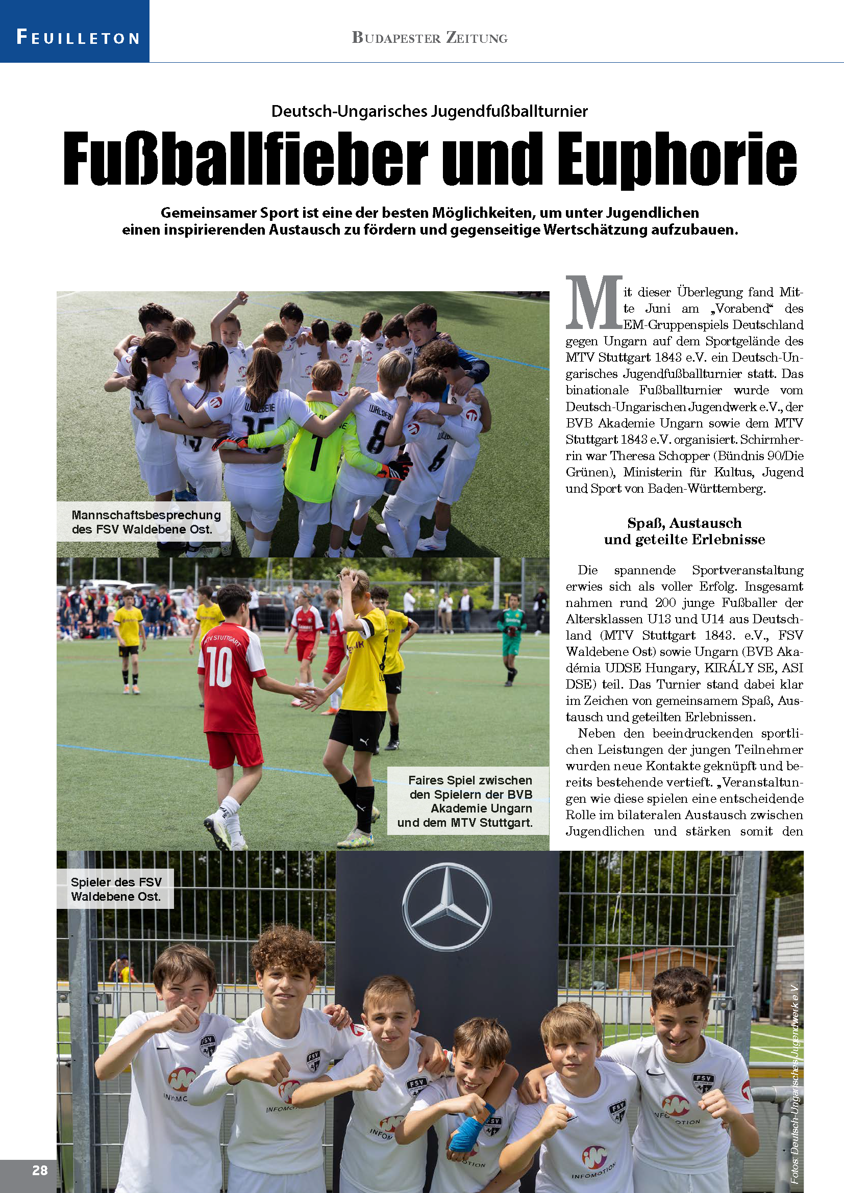 Am vergangenen Wochenende, dem 15. und 16. Juni, fand das Deutsch-Ungarische Jugendfußballturnier bei der MTV-Fußballakademie Stuttgart statt. Die Veranstaltung wurde in Zusammenarbeit mit dem FSV Waldebene und dem Deutsch-Ungarischen Jugendwerk organisiert. Das Turnier erwies sich als großer Erfolg für Klein und Groß. Mehr als 200 junge Talente nahmen an diesem kleinen EM-Turnier teil und erlebten die gemeinschaftsbildende Rolle des Sports, die zu gegenseitigem Respekt und Wertschätzung führte.