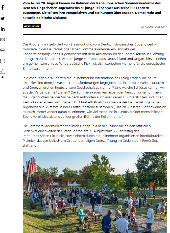 Die Sommerakademie zum Gedenken an das Paneuropäische Picknick war auch in diesem Jahr wieder ein großes Highlight - neben der alljährlich im August stattfindenden Deutsch-Ungarischen Sommerakademie fand in diesem Jahr zusätzlich die erste Paneuropäische Sommerakademie mit Teilnehmerinnen und Teilnehmern aus sechs Ländern der EU statt. In diesem Rahmen wurden mit insgesamt über 50 Jugendlichen Gespräche mit Zeitzeuginnen und Zeitzeugen sowie Expertinnen und Experten organisiert, ein symbolisches, interkulturelles Picknick im Gedenkpark veranstaltet, besondere Momente des europäischen Austauschs geschaffen, und gemeinsam dem Paneuropäischen Picknick als historisches Moment für den Fall des Eisernen Vorhangs sowie der europäischen Einigung erinnert.