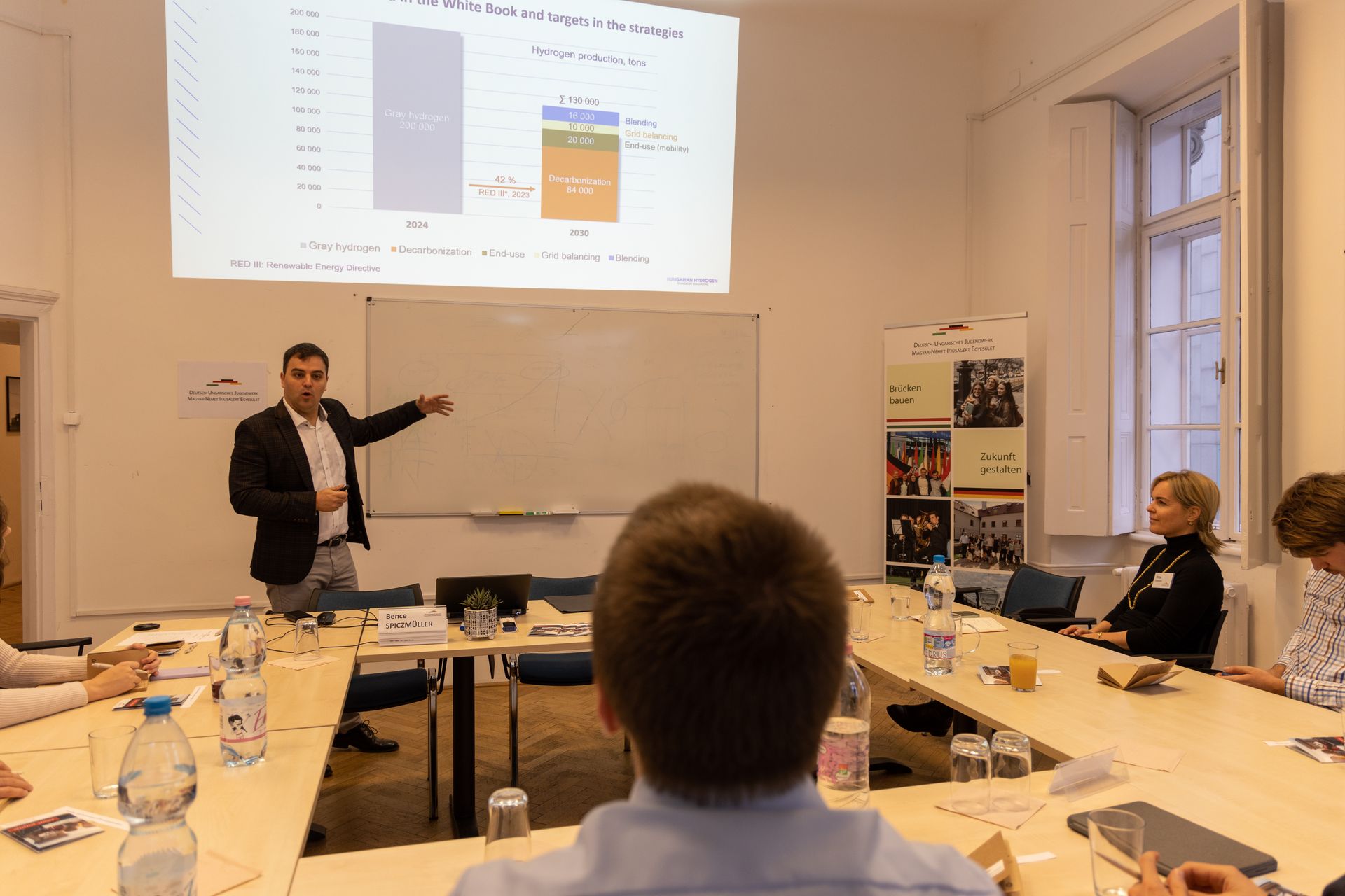 Anschließend stellte Bence Spiczmüller, Referent für internationale Angelegenheiten des Verbands für Wasserstofftechnologie in Ungarn, die Arbeit seines Verbands vor. Er ging dabei auf die spezifischen Potenziale und Herausforderungen der Wasserstofftechnologie in Ungarn ein und zeigte die wichtigen internationalen Verbindungen und Entwicklungen auf.