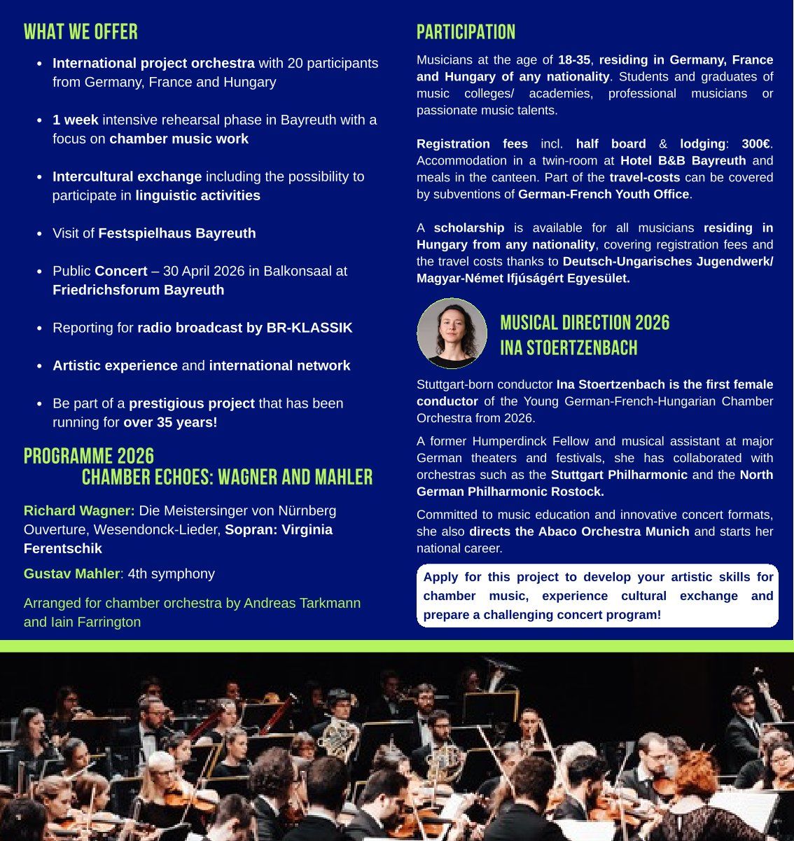 Die jährliche Orchesterakademie des deutsch-französischen Forums junger Kunst Bayreuth legt ihren Schwerpunkt in diesem Jahr auf Kammermusik. Junge Musikerinnen und Musiker aus Deutschland, Frankreich und Ungarn kommen in diesem trinationalen Projekt für eine einwöchige Arbeitsphase in Bayreuth zusammen.